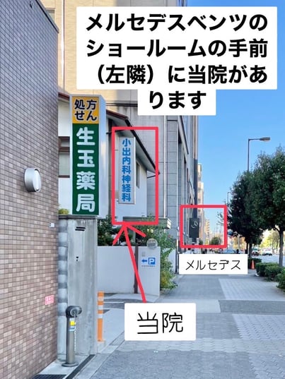 ・「メルセデスベンツ」のショールームの次(左隣)に当院があります